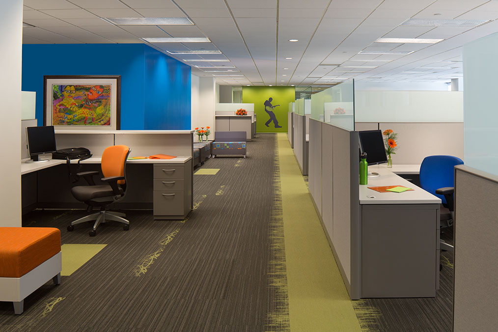 The client requested replacement of a wall of cabinets with a wall of color and new art. The silhouette on the far wall was photographed elsewhere in the offices and incorporated. Certain elements in the view were lighted in other exposures and were also brought in. Highlights were reduced and fixtures were removed.